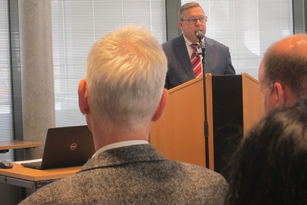 Bezirkstagspräsident Martin Sailer und Prof. Dr. Klaus Wolf präsentieren den DigiLABS im Verwaltungsgebäude des Bezirks Schwaben in Augsburg.