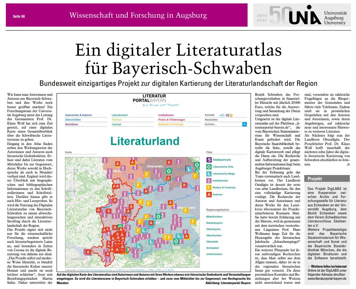 Am 16. Juli 2020 berichtete die Universität Augsburg in ihrer Veröffentlichung „Wissenschaft und Forschung über den Digitalen Literaturatlas (Bericht anbei).